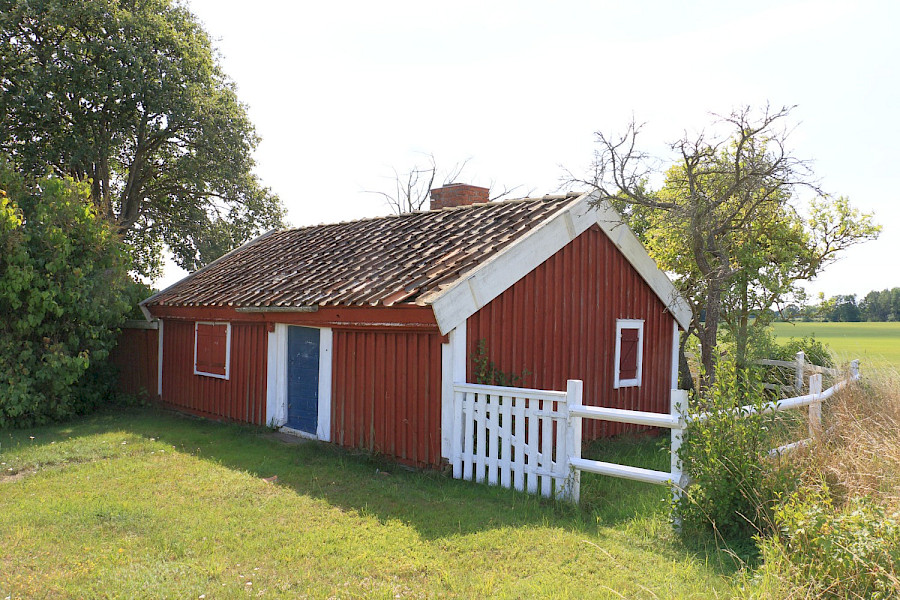 Stugan ligger på Skällenäs 1, som på 1800-talet rymde två gårdar, vardera på ett halvt mantal. De slogs ihop till en gård och manbyggnaden till den nedlagda gården flyttades in i samhället och var länge känd som "Jockes" hus. Gårdens byggnader låg på åkern bakom stugan.