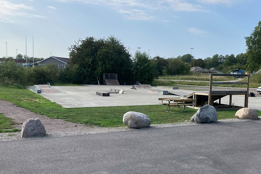 En streetyta i betong med curbs, rails, banks, manualpads m.m. i betong och trä. Miniramp byggd 2018.