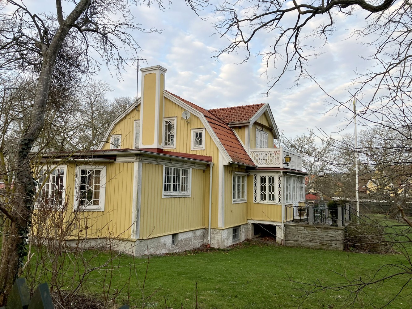 Mycket välbevarad högreståndsvilla som i sina äldsta delar är uppförd före 1832 på annan plats på fastigheten. Byggnaden fick sin nuvarande placering 1911 då den även byggdes till efter ritningar av arkitekten J Fred Olson. Bostadshuset är i 1,5 våningar med brutet tegeltäckt tak. Mot trädgården har huset en påkostad och detaljrik glasveranda med ovanpåliggande balkong och stor frontespis. På baksidan är det ytterligare en frontespis och en mindre glasveranda. Gavelsidorna är tillbyggda med 2 låga volymer med plåttak. Två skorstenar är placerade mot gavlarna och bidrar till husets särpräglat utseende. Byggnadens fasader är klädda med locklistpanel i gul kulör. Knutar och snickerier är vita. Fönstren har olika former, indelningar och spröjsning. Glasverandorna och frontespiserna har småspröjsade mycket dekorativa fönster och pardörrar. Samtliga fönster och dörrar är ursprungliga eller utförda som mycket noggranna kopior av originalet.