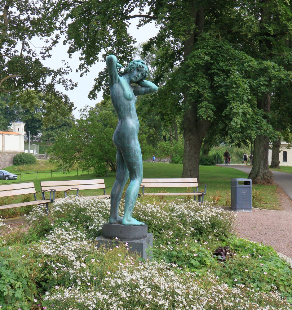 Flicka knyter sitt hår är placerad mitt emot Dryadparken. Konstnär: Tore Strindberg (1946)
