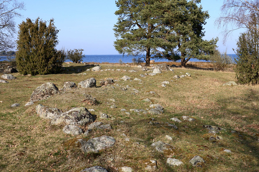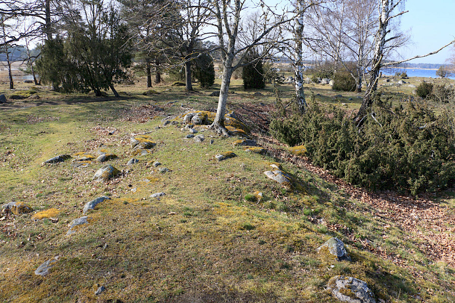 Här ute på Svinös yttersta udde ligger resterna av en fast försvarsanläggning, en skans, från 1600-talet. Vallarna som syns här är allt som återstår. Kalmar har alltid varit en befäst stad. Under medeltiden var bara tre svenska städer befästa, nämligen Kalmar, Stockholm och Visby. I inledningen av Kalmarkriget 1611-1613 anlade såväl danskar som svenskar i hast ett stort antal befästningar runt staden. En av de danska befästningarna byggdes här på Svinö. Svenskarna försvarade sig från tre hopkastade skansar; en på södra Svinö, en på Jutnabben samt en på norra Skallö. Där vilar idag en av bropelarna till Ölandsbron.