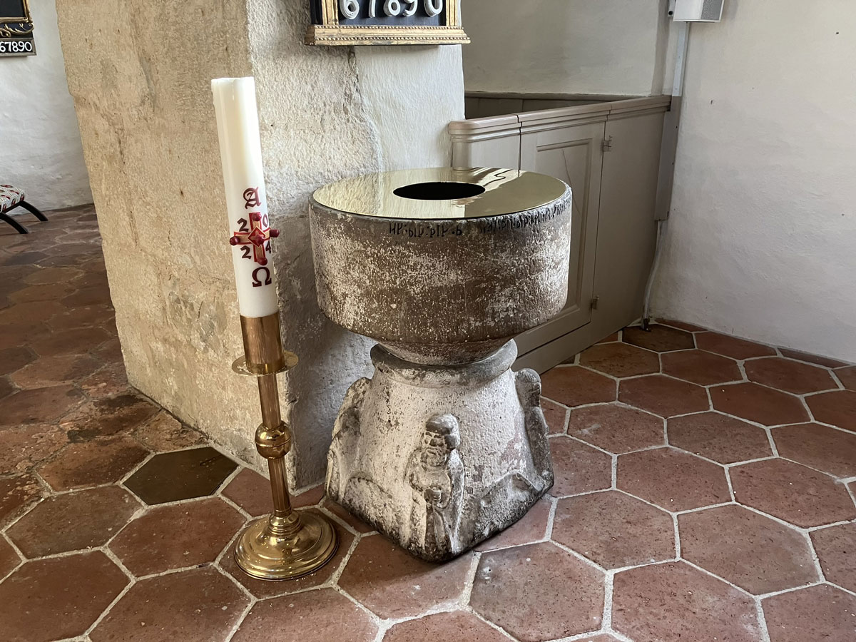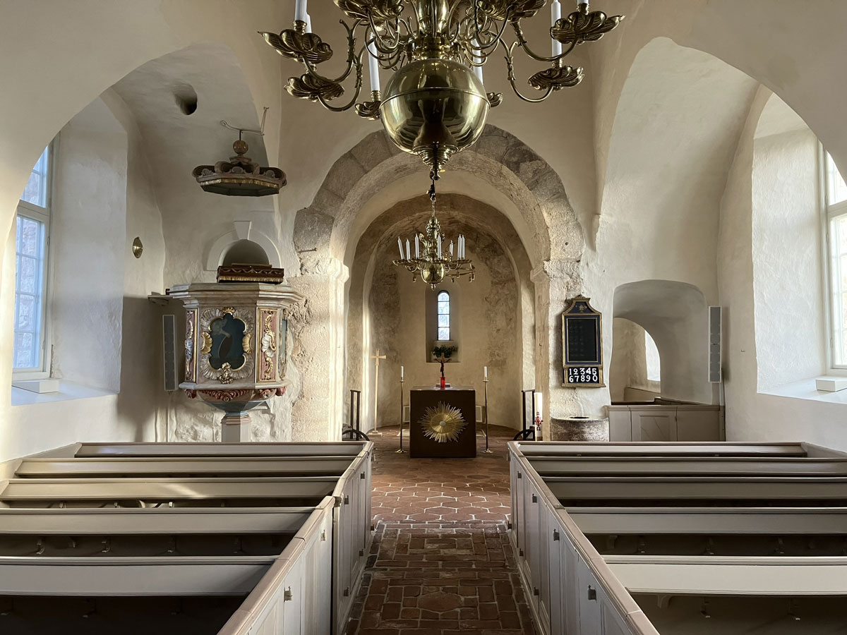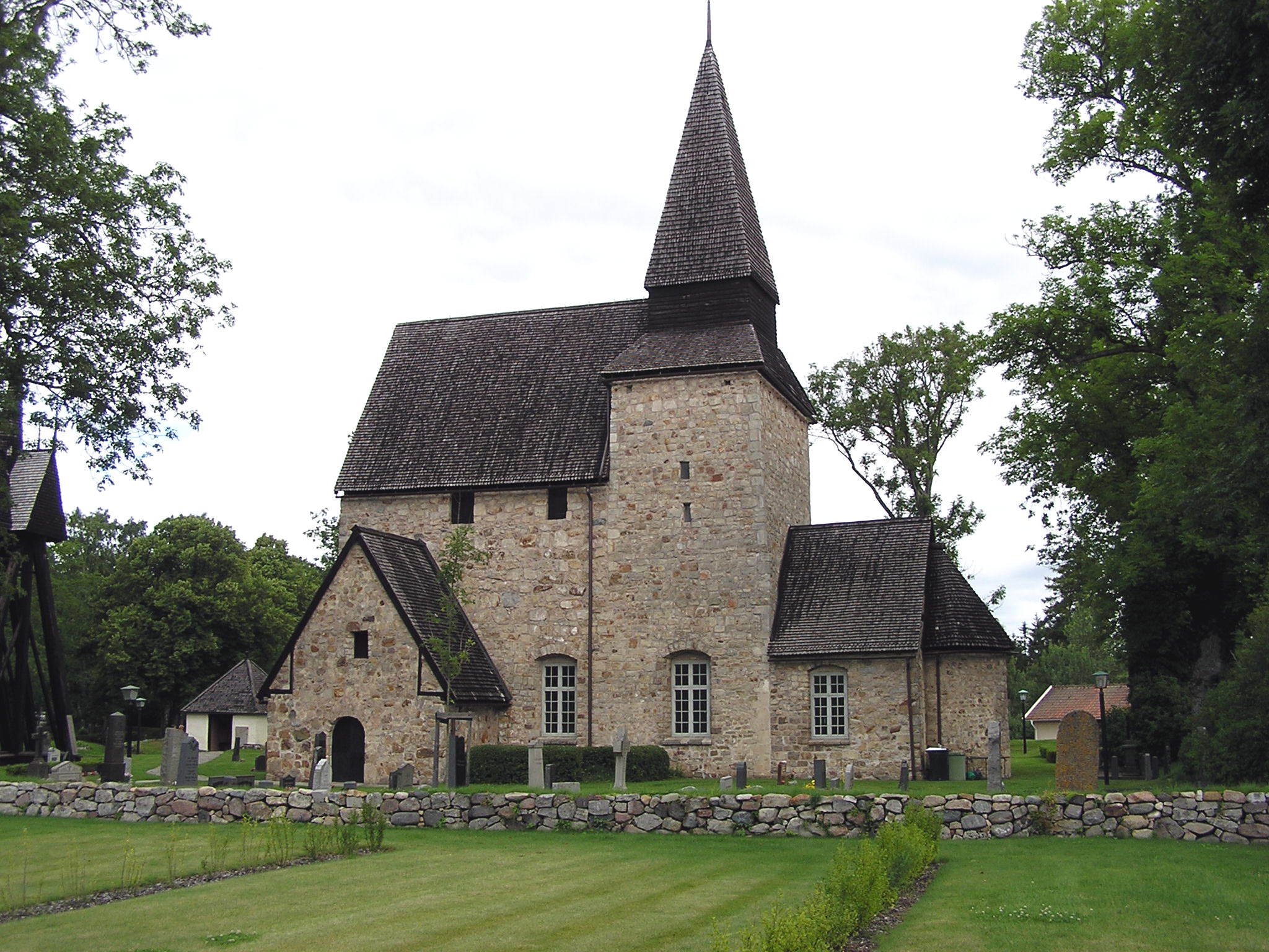 Kyrkan är uppförd av sandsten och har tak av tjärat träspån. Den är idag utan puts så att murverket syns. Man fick år 1997 tillbaka den medeltida dopfunten, som under en tid funnits på Statens historiska museum. Funten har runinskrift huggen av stenmästare Jakob i början av 1200-talet. Altarskivan är medeltida med relikgömma.