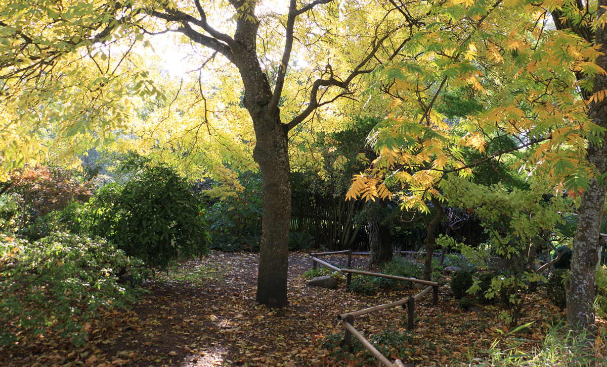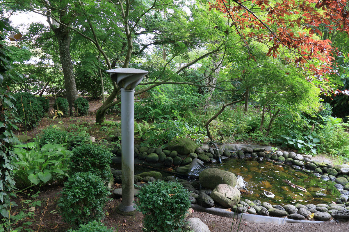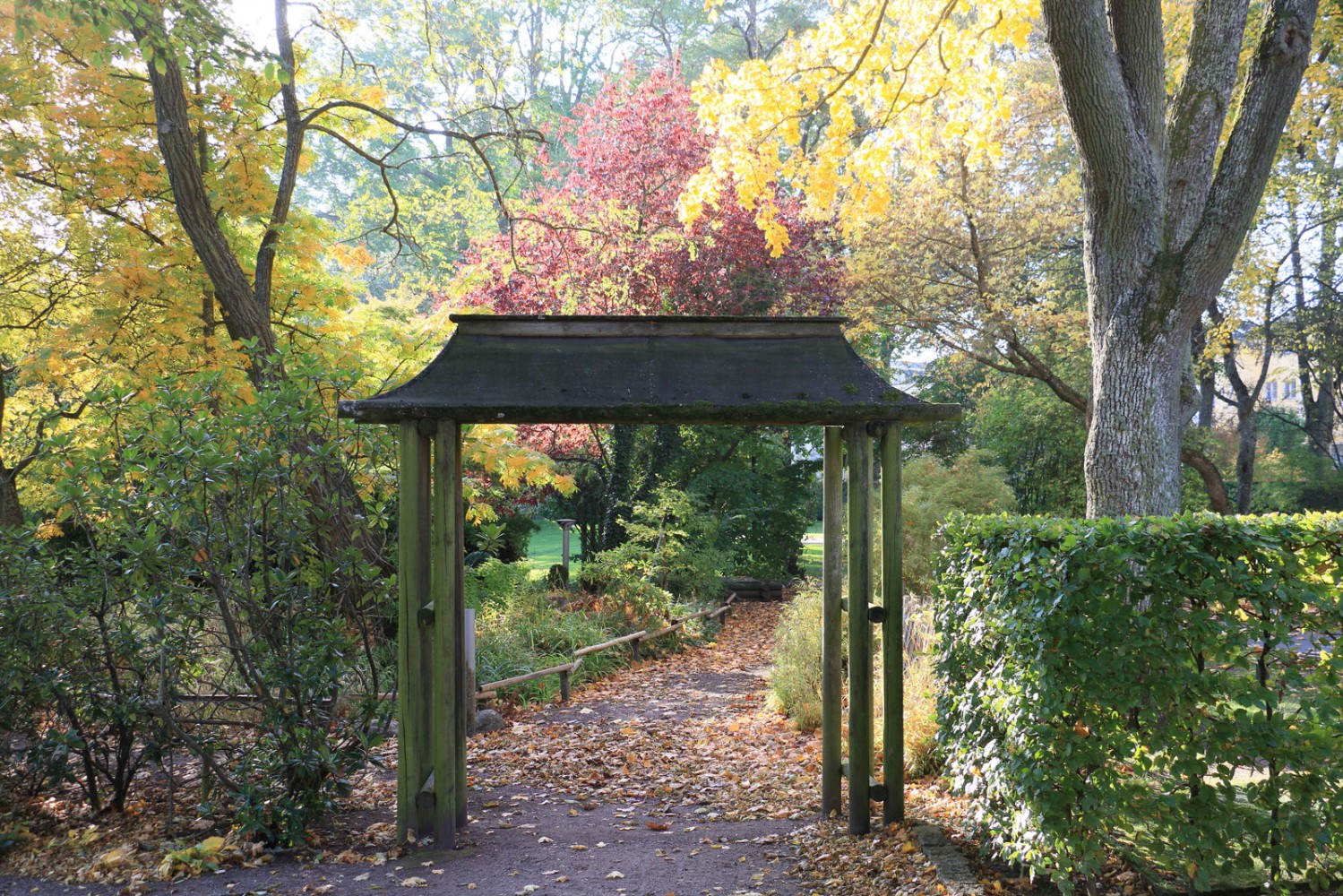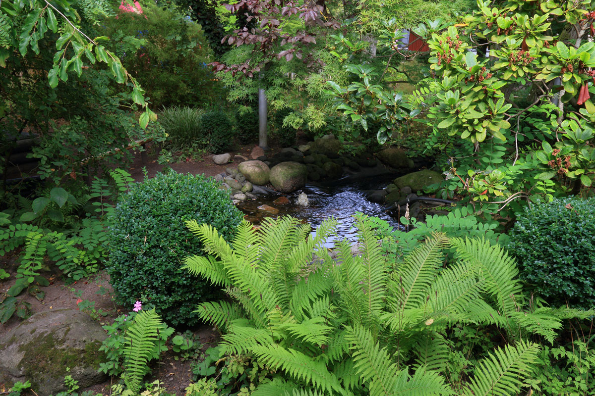 Japanska trädgården, ett woodland, som är inneslutet och skyddat mot omvärlden. Träd ger skugga och skymmer himlen med höga grenar. Den japanska trädgården skapas med de fyra elementen växter, stenar, vatten och ornament.