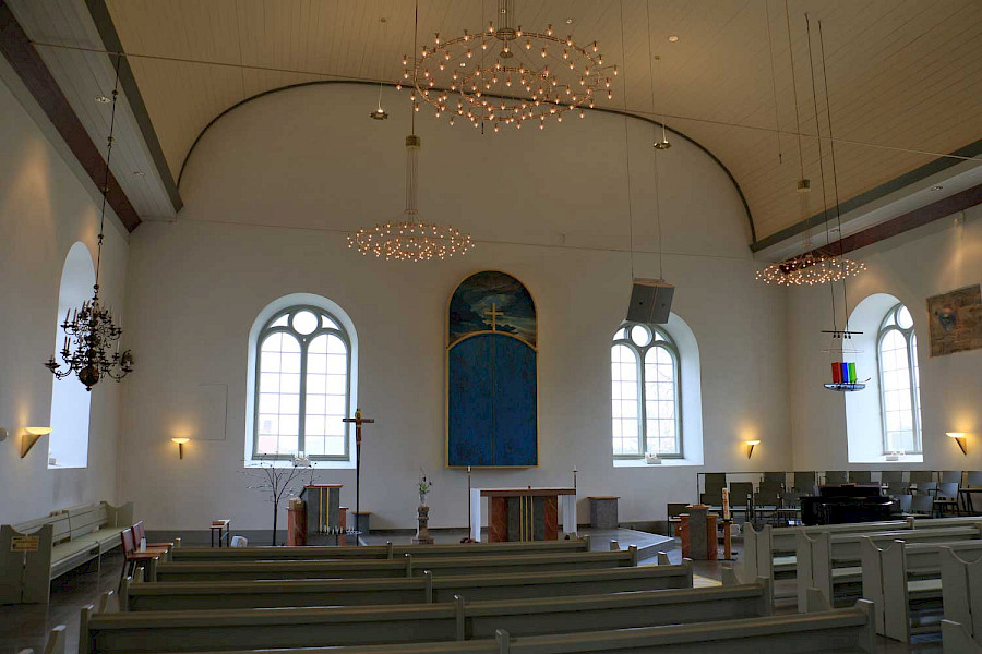 Efter en förödande brand 2001 stod endast yttermurarna kvar och en arkitekttävling utlystes för en återuppbyggnad. Återuppbyggnaden påbörjades 2003 efter det vinnande förslaget av Jerk Alton. Påskdagen 2005 invigdes den återuppbyggda kyrkan av biskop Anders Wejrud. Utvändigt är inte mycket förändrat men invändigt har kyrkan anpassats till nutidens behov. Kyrkorummet har förminskats genom att orgelläktaren utvidgats och nya lokaler tillskapats i underliggande utrymmen. Den tidigare sakristian är numera sidokapell. En ny altartavla har målats av Monica Strandberg och ett kyrkskepp i glas har gjorts av Bertil Vallien samt ett Jesusansikte i glas.