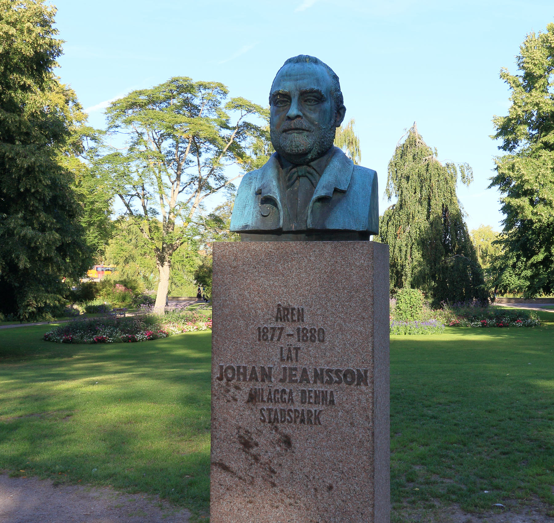 Skulpturen är en avbildning av stadsparkens grundare, den inflytelserike grosshandlaren och kvarnägaren Jeansson. Här tittar han upp mot det hus han byggde på 1860-talet, idag nuvarande Slottshotellet. När Stadsparken invigdes 1880 hade familjen Jeansson flyttat till det så kallade Lilla Hovet på Larmtorget. Monumentet invigdes 1937, ca 40 år efter Jeanssons död. Konstnär är Arvid Källström.